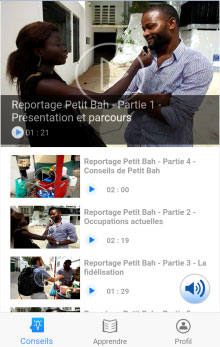The challenge was to create a very simple and comprehensive content for the vendors — and also at a lower cost for us for this pilot phase. We first approached some of them who, thanks to their rich career, were likely to inspire their colleagues and then did video interviews either in French, Wolof or Pulaar. We also created a mini English course with standard phrases to use during a sale. We started on a serie of illustrations with an audio file, saying the word in Wolof, then in English. Another customer relationship module has been created in the same way.