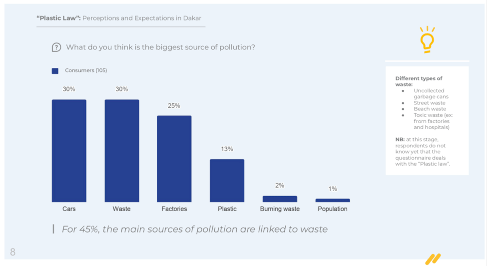 In our July 2019 study, 86% of those interviewed indicated that they were little or not satisfied with the air quality in Dakar. For 45% of respondents in our new study, the main source of pollution is linked to waste (including plastic, 13%, and burning waste, 2%), followed by cars (30%) and industries (25%).