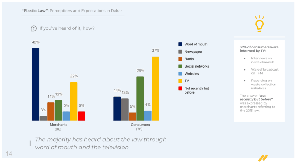 Respondents express their perceptions and expectations of the law n°2020–04 of January 8th, 2020, commonly known as the “Plastic law”, which aims to prevent and reduce the environmental impact of plastic in Senegal and inscribes itself in the national “Zero Waste” program of the Senegalese government.