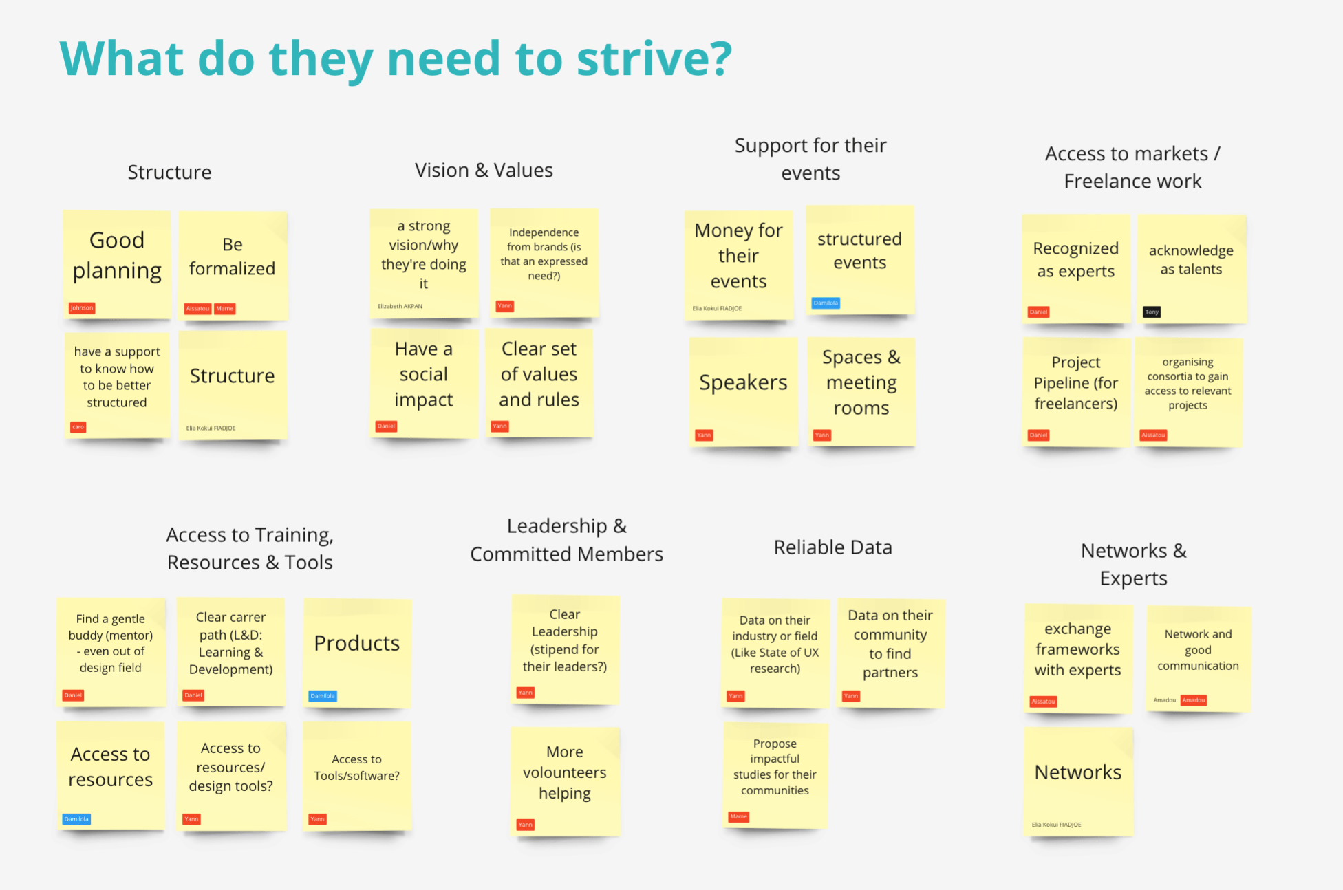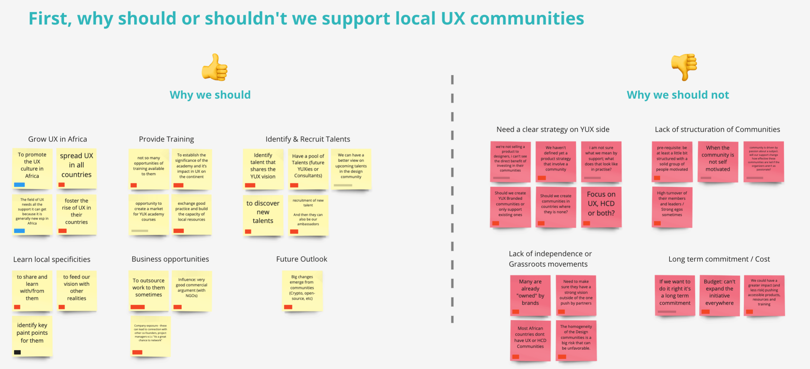 As you can see in the picture above, our team identified several breaks that can make supporting local UX groups a challenge, the main one being their lack of structuration, motivation, or high turnover in the leadership of communities. On the other hand, we also need a clear structure and direction on our side before engaging with them otherwise, we may not be consistent and create more confusion than really help. Also, several communities are already sponsored (owned?) by brands like Figma, Google, or others. We would definitely rather invest in groups that affirm a strong leadership and independence from any company (including ours), like for instance UX Ghana or UX Kitchen in Kenya.