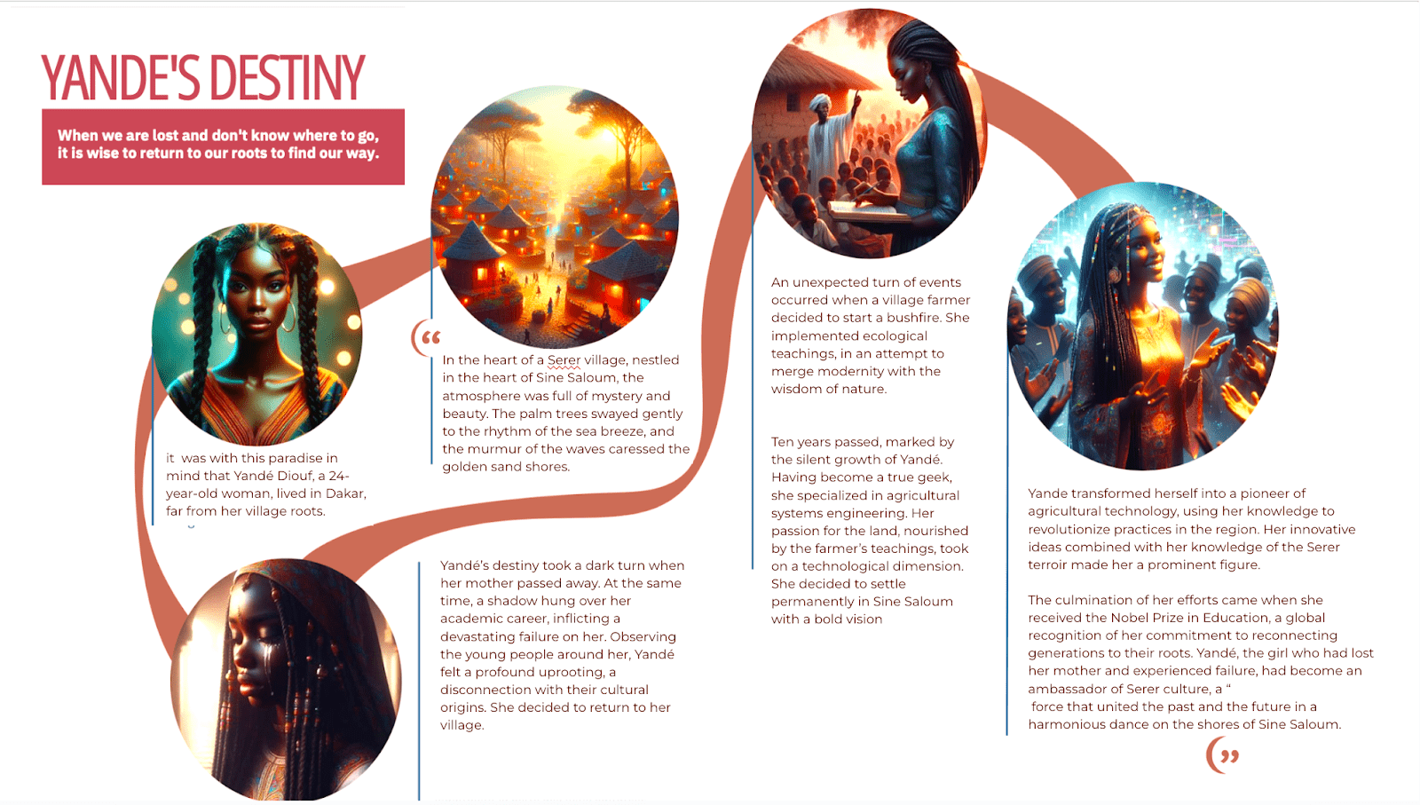 Illustration with AI: Participants explore the potential of artificial intelligence to visually bring their stories to life, creating AI-generated images to accompany their narratives. A comprehensive report, presented in both French and English, is then shared with key stakeholders, including government officials.