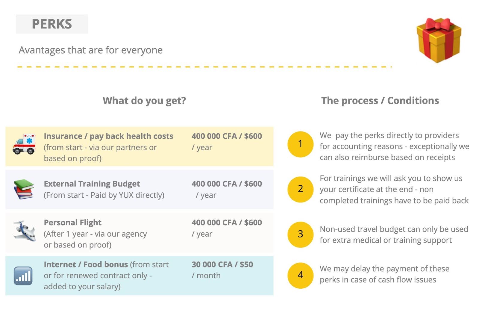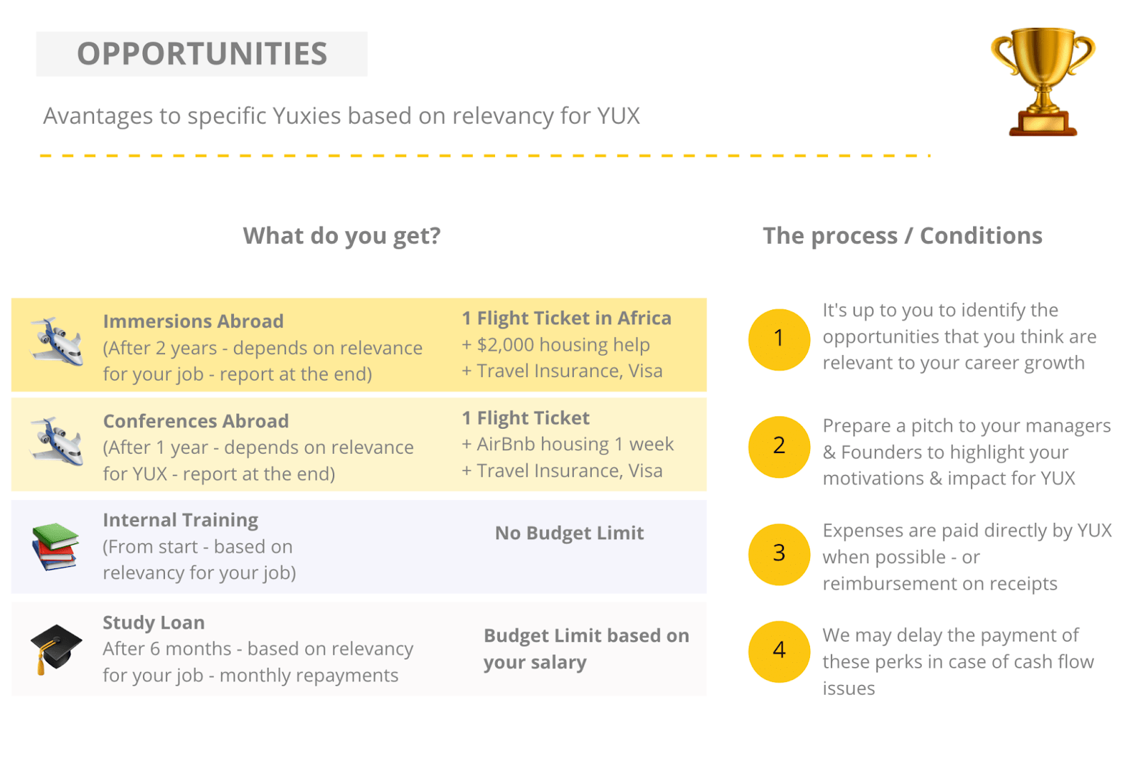 Personal Flight ticket: After the first year at YUX, Yuxies get the opportunity to receive a flight ticket to go to one of the African countries of their choice. The goal is to allow the employees to immerse themselves abroad to learn new cultures or even languages relevant to their work (English for non-English speaking employees). It also allows them to take a break and recharge. However, the issue is that some employees don't want to take that opportunity but prefer exploring their own countries.